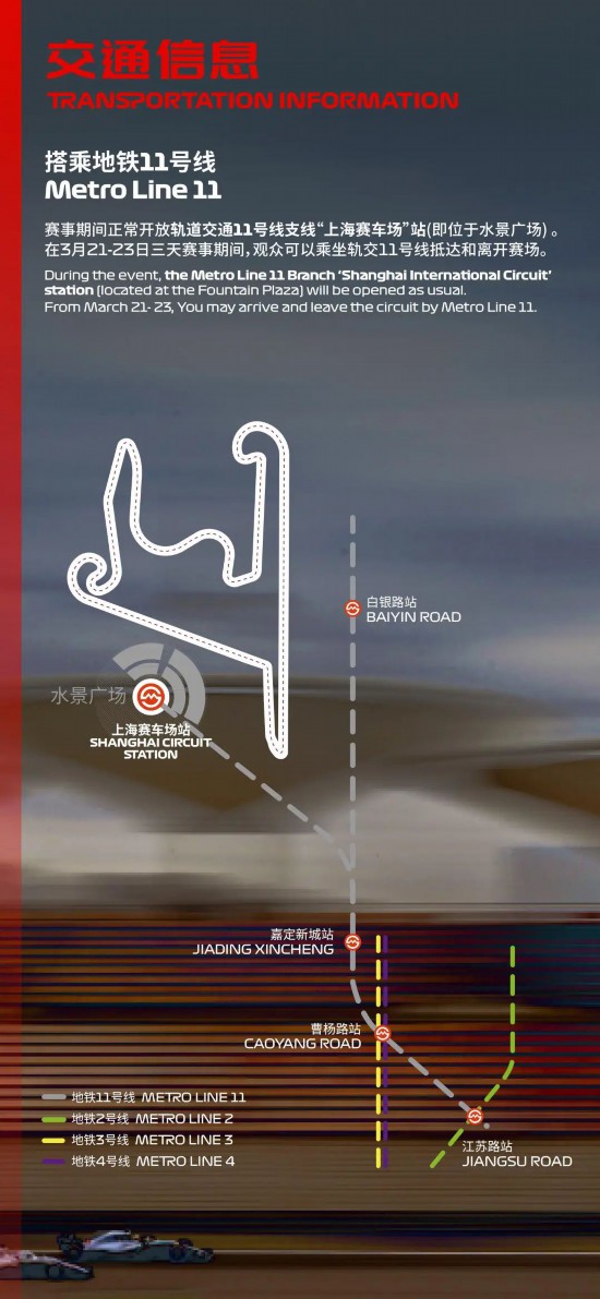 上海國際賽車場位于上海市嘉定區伊寧路2000號。賽事期間,強烈建議大家綠色出行,乘坐軌道交通11號線,方便快捷又環保,還能避開擁堵,輕松抵達賽場!另外也請盡量提早錯峰出行,避免高峰期安檢入場排長隊。