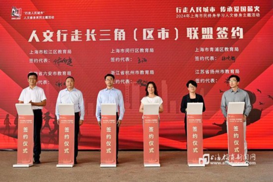 長三角地區終身教育協同發展,是長三角一體化發展戰略的重要組成部分?;顒蝇F場,上海市閔行區教育局與浙江省杭州市教育局,上海市松江區教育局與安徽省六安市教育局,上海市青浦區教育局與江蘇省揚州市教育局跨越地域界限,攜手加入人文行走長三角(區市)聯盟。據悉,長三角(區市)人文行走聯盟于2023年5月在滬成立,旨在深度挖掘長三角地區經濟、社會、文化、歷史等方面的精神內涵和教育價值,形成具有地方特色的“人文修身學習點”,合力打造一批跨省市人文行走學習圈,構建一批人文行走學習鏈。通過跨省市主題行走,推動學習方式的變革;以流動學習模式,進一步豐富人文行走學習內容,實現優質資源“引進來,走出去”,教育影響輻射能力穩步增強。