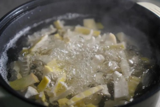 1.春筍剝殼切丁,滾水焯去澀味。