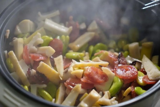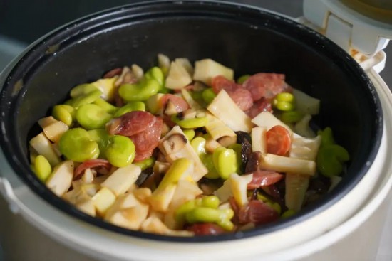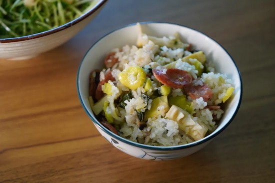 這道飯融合了冬日的醇厚與春日的清新,春筍鮮脆爽口,蠶豆清甜粉糯,香菇鮮香滑嫩,臘腸咸香油潤,一口下去,春天的儀式感瞬間拉滿。