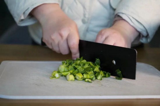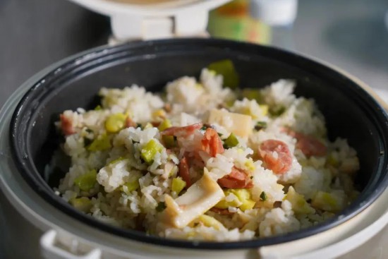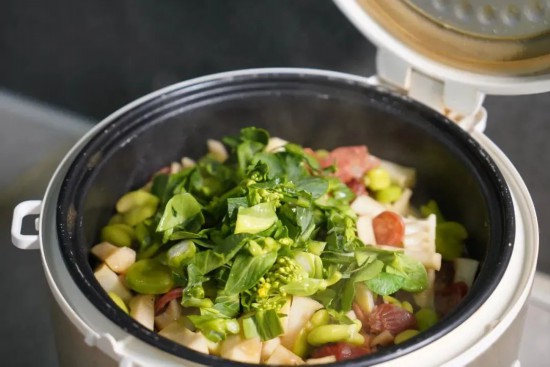 5.菜心切碎后輕鋪表層,電飯煲一鍵鎖住春色,燜熟后即可。