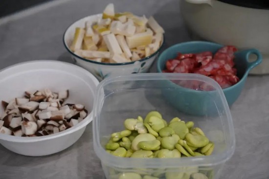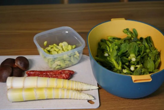 春筍、臘腸、蠶豆、香菇、青菜、米、生抽、鹽、味精、胡椒粉、食用油