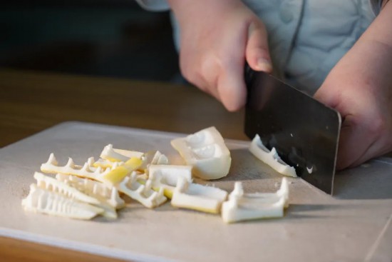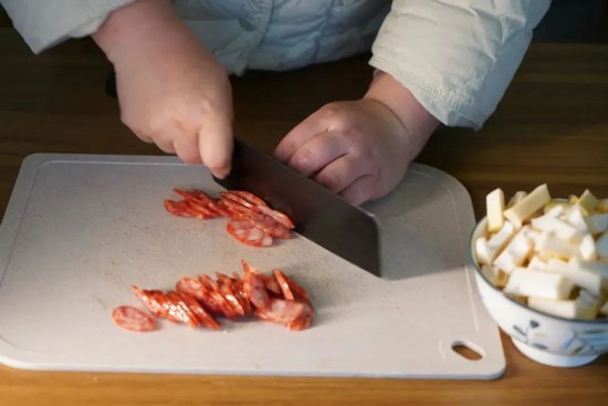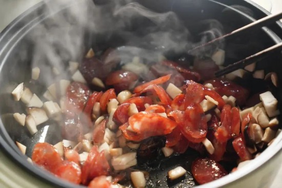 2.臘腸斜刀切片,冬日腌漬的脂香格外濃郁。紅白相間的薄片在熱鍋中卷起,逼出琥珀色油脂。