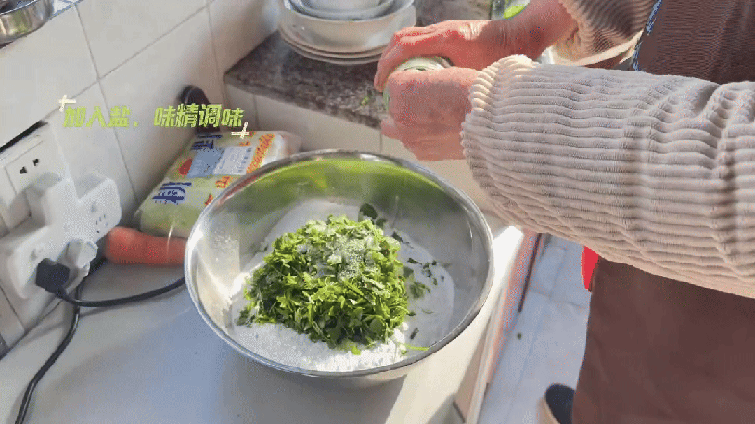 在草頭碎和糯米粉中加入鹽、味精調味。