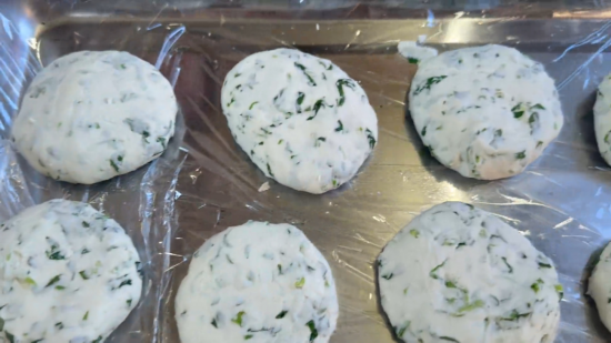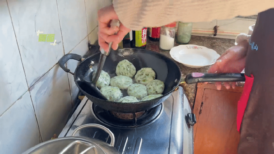 加入開水將草頭碎和糯米粉一起揉成團,再壓成一個個掌心大小的圓餅。