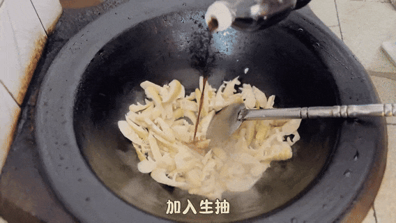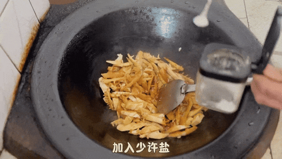 鍋中倒油,放入春筍煸炒至微黃,加生抽、老抽、鹽提味調色,翻炒均勻。