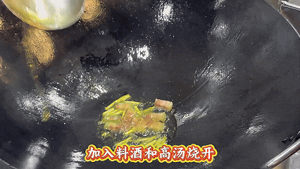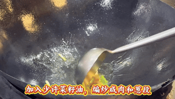 鍋內加入少許菜籽油,煸炒咸肉和蔥段,并加入料酒和高湯燒開。