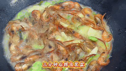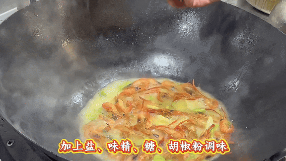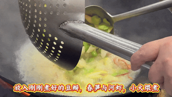 放入焯水后的豆瓣,春筍,以及炸過的河蝦,小火煨煮;加入鹽、味精、糖、胡椒粉調味。