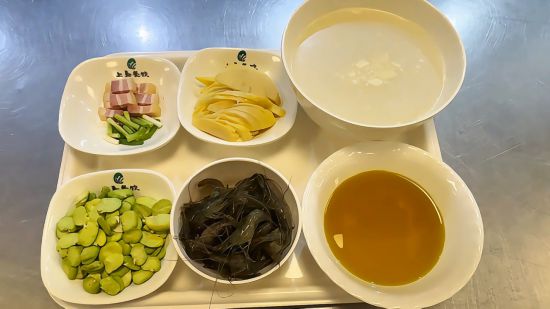 材料:春筍、豆瓣、河蝦、咸肉、高湯、蔥段、菜籽油、料酒、鹽、味精、糖、胡椒粉
