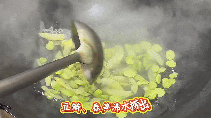 將豆瓣、春筍焯水后撈出;河蝦過油后撈出。