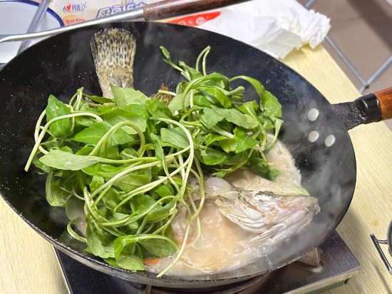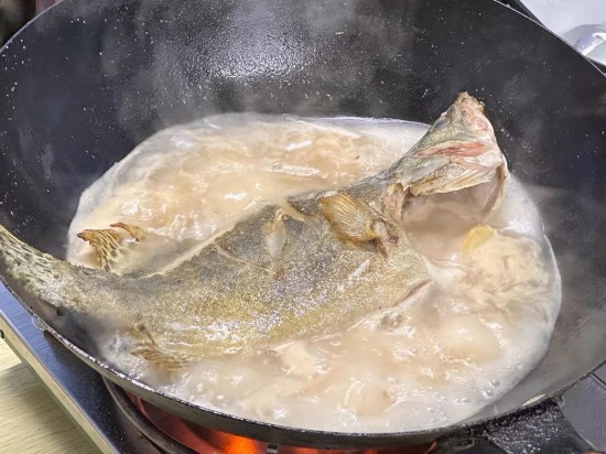 3.至湯色變白后,放入河蝦繼續燉煮。