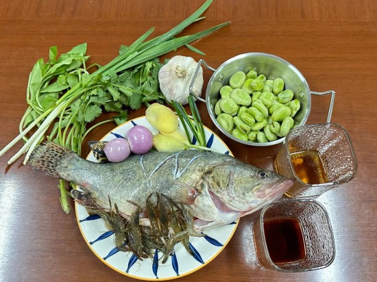 桂魚、河蝦、馬蘭頭、韭菜、蠶豆、老姜、蔥段、香菜、料酒、生抽、食用油、食鹽
