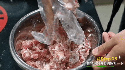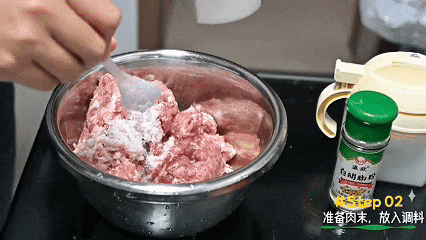 準備肉末,放入食鹽、糖、白胡椒粉、淀粉、水。
