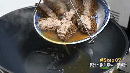 將蒸羊肚菌蒸出的汁水倒入鍋中。