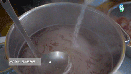第二步:水開后加入紅豆沙,攪拌均勻,加入白糖,用生粉勾芡。