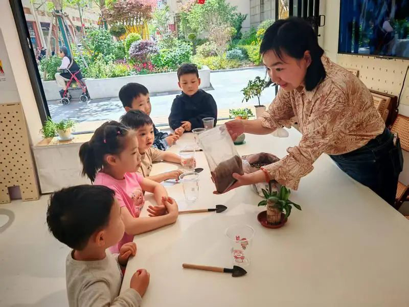 這幕場景,就發生在近日半淞園路街道西凌第一幼兒園舉辦的一場環保種植活動中。老師指著麻布袋,耐心給小朋友們介紹:“這些咖啡渣可是寶貝,經過發酵處理,能改善土壤質量,讓植物茁壯成長呢!”