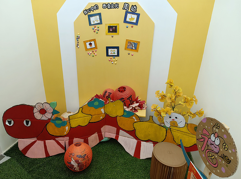 結合“校居共建”,周邊學校的學生利用廢紙板設計出了很多藝術裝置?!斑@條小蛇是我設計的,上面的柿子元素寓意著事事如意,還有一個很可愛的小湯圓是為了契合元宵節?!蔽迥昙墝W生張景云設計的藝術裝置煞是招人喜愛。