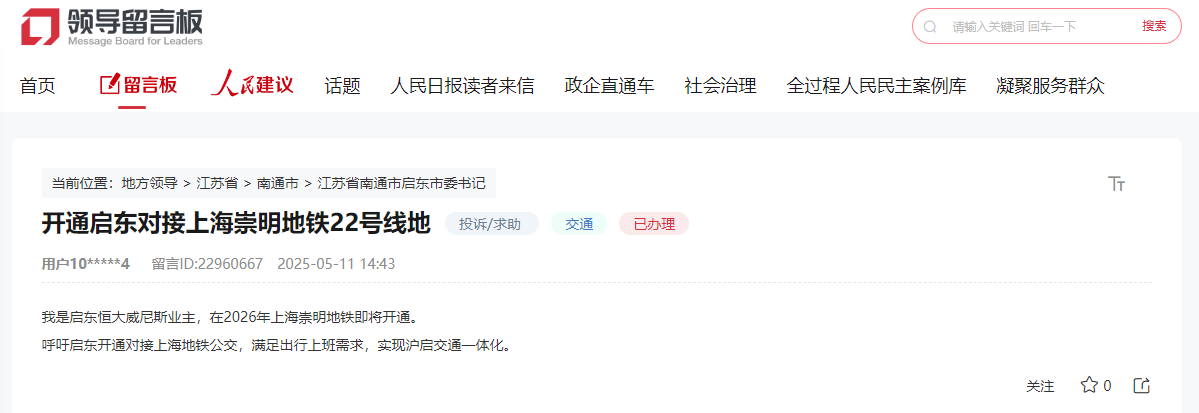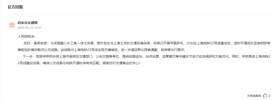 近日,有網友通過人民網“領導留言板”留言稱,2026年上海地鐵崇明線即將開通,呼吁開通啟東至上海地鐵22號線的接駁公交,滿足出行上班需求,實現滬啟交通一體化。