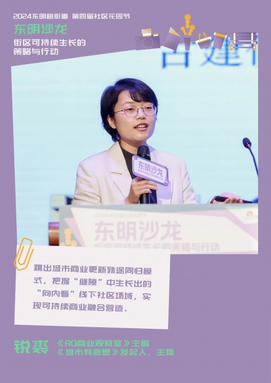 《RQ商業觀察室》主編、《城市有意思》發起人、主播銳裘圍繞“地方更新與永續經營”的話題,分享將各界聯合以形成符合下一時代永續經營方法的方式。她提出“placemaking”的概念,認為需要基于地方的特色,制定并踐行具有可持續的運營方式,以實現地方的營造與創生。跳出城市商業更新殊途同歸模式,把握“縫隙”中生長出的“向內看”線下社區場域,實現可持續商業融合營造。