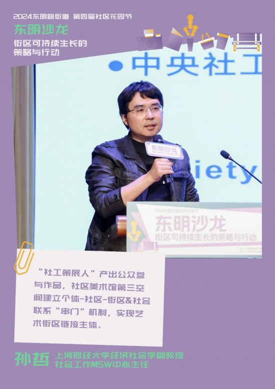 上海財經大學經濟社會學副教授、社會工作MSW中心主任孫哲圍繞社會工作中的創新角色“社工策展人”,分享社工策展人們以社會問題為核心,通過公共藝術的方式激發群眾參與的動力機制,認為在“策展-看展”的過程當中,社區的大門能夠有機打開,在地居民在共創過程中能建立街區認同。在新時代的空間中,需要“不斷開門,形成串門機制”,從個體走向社區,社區走向街區,街區走向社會,實現藝術街區鏈接主體。把看展和策展作為公共參與的一種新機制,進而激活社區的社會資本。