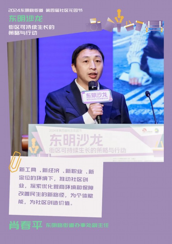 上海市浦東新區東明路街道黨工委書記、人大工委主任沈春雷為沙龍致辭。東明路街道踐行全過程人民民主理念,實施“聚明心”黨建工程,編制“宜居東明 人民社區”三年行動計劃和五個子規劃,推動城市更新和場景營造、數字化轉型、安全韌性、法治人文等建設。街道以“一刻鐘便民生活圈”建設為契機,聚焦社區經濟培育,做大“共建圈”;深化高質量基層治理,做強“共治圈”;雙輪驅動協力推進,做實“共享圈”。匯聚眾智,讓社區經濟與治理相互促進,打造參與式治理品牌。
