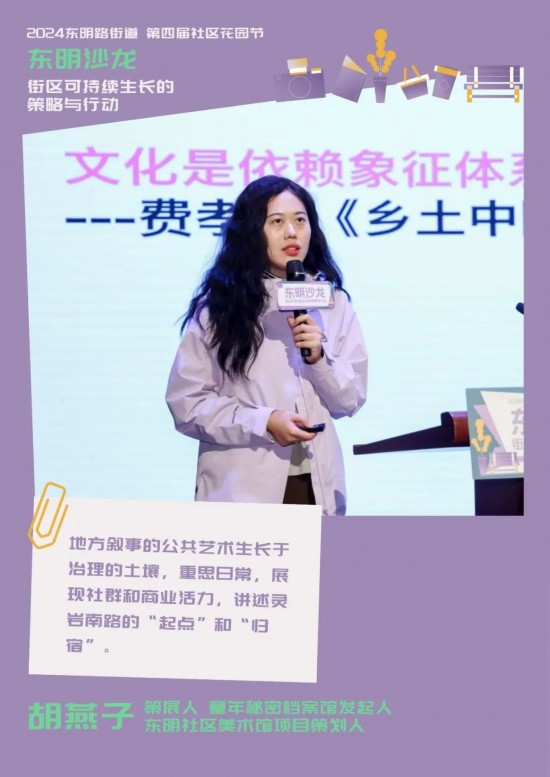策展人、童年秘密檔案館發起人、東明社區美術館項目策劃人胡燕子通過公共藝術完成地方敘事,梳理地方文化與身份;通過社區美術館來激活街區商鋪空間,從參與式的藝術行動到常態化的公共空間,以嵌入式的場所來重思日常,重建日常。街區可持續更新需要各方力量的匯聚,需要用創造性的方法來讓地方“可見”。大量前期看不見的“土壤改良”工作,才能開出后續看的見的花朵。