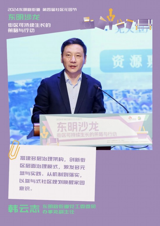 東明路街道黨工委委員、街道辦事處副主任韓云志進行了“東明路街道參與式社會治理行動實踐”主題分享,對東明近幾年的實踐成果進行了匯報。在街道黨工委領導下,明確了打造“宜居東明 人民社區”的發展愿景,立足“五個精”,打造“五個社區”,最終實現“五個城”。在街道層面搭建五級治理架構,在居民區層面通過“1+3+N”的方式引入多方力量,在街區層面通過“1+4+X”的方式打造街區治理共同體,創新基層治理模式,激發多元參與實踐。從機制到落實,以參與式社區規劃喚醒家園意識。