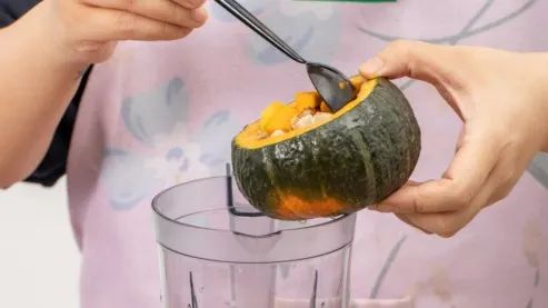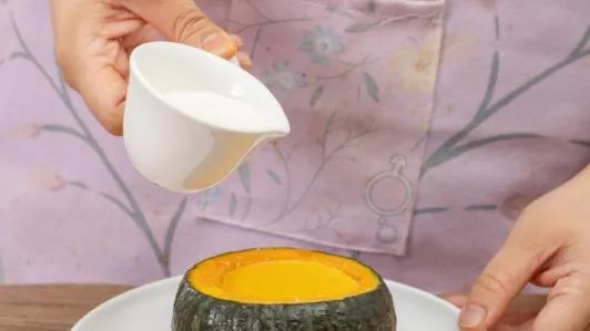 取出南瓜,將里面的餡料放進榨汁機打碎成糊狀,再倒入南瓜中,淋上奶油裝飾即可。