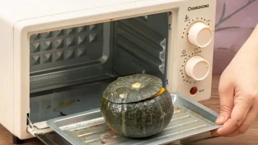將挖出來的南瓜塊加進去,蓋上蓋子,放入預熱好的烤箱,設置200℃烤1小時。