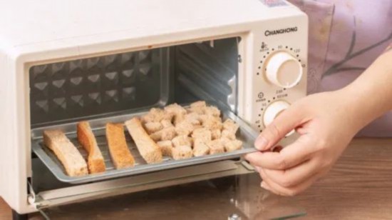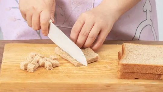 全麥吐司切掉邊緣,切成大小一致的面包塊,放進烤箱設置177℃烤15分鐘 。
