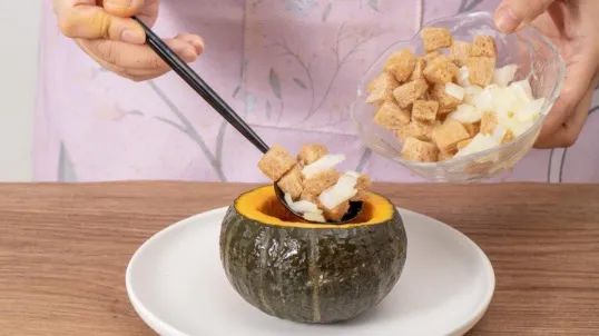 南瓜里外都刷上黃油,把炒好的洋蔥面包干倒入南瓜,加入芝士碎和雞湯,適當調味。