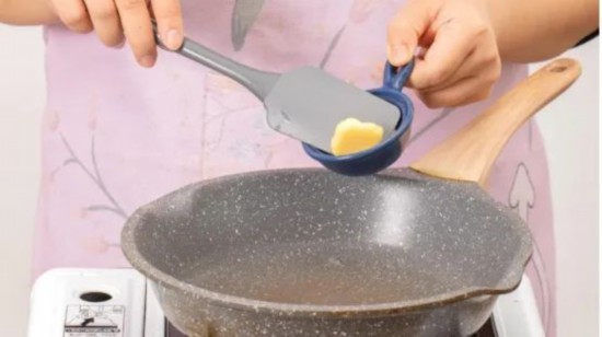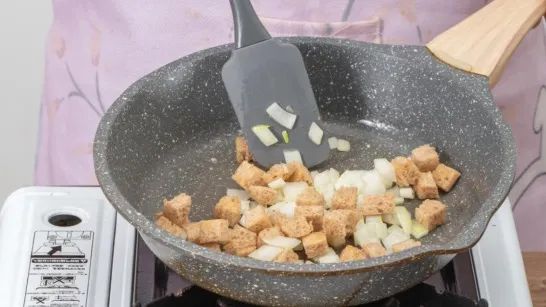 鍋內下入黃油至融化,加入洋蔥粒,加入烤好的面包塊,翻炒3分鐘。