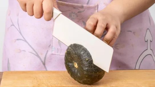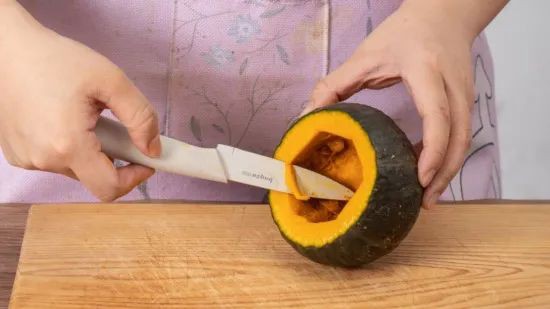將貝貝南瓜切開頂部并去籽,注意開口處需切得大一些,易于后續操作。