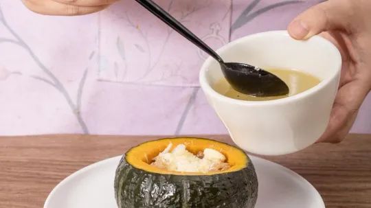 烤過的貝貝南瓜甜糯中透著香氣,濃郁雞湯與奶油交融,入口絲滑,回味悠長~