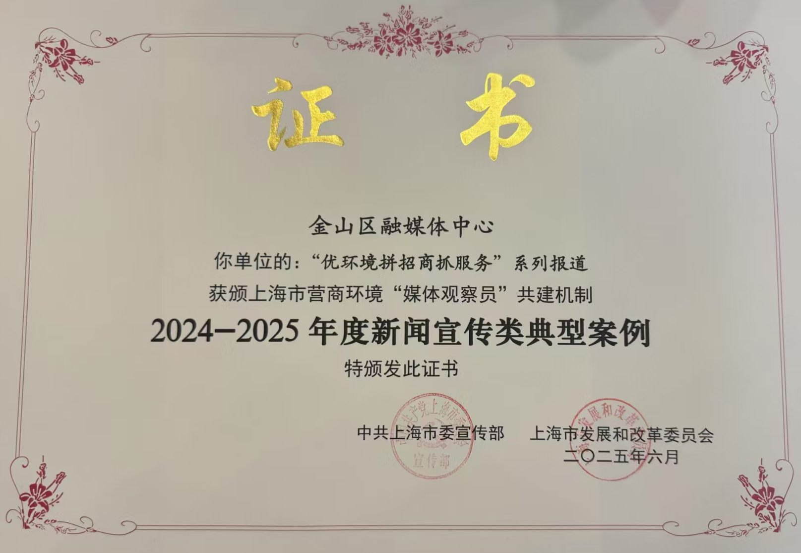 其中,金山區融媒體中心制作的《“優環境拼招商抓服務”系列報道》獲頒新聞宣傳類典型案例,這既是對金山區營商環境宣傳工作的肯定,更是對其優化營商環境實踐成效的有力見證。