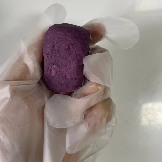 3. 蒸熟的紫薯壓成泥狀,包裹香蕉,捏成方塊造型。
