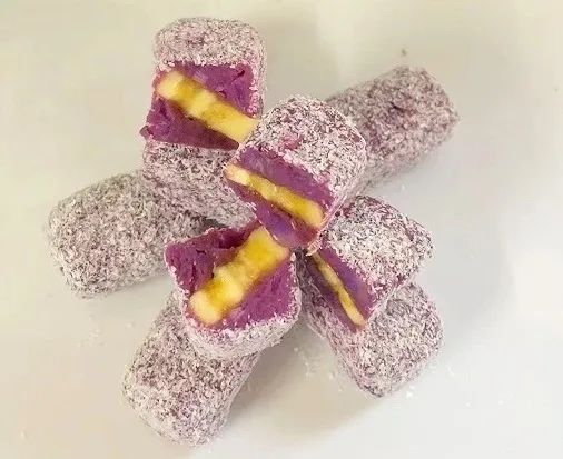 紫薯蒸熟搗泥后包裹著金黃軟糯的香蕉,再均勻裹上一層雪白的椰蓉,造型小巧可愛。一口下去,椰香、薯香與香蕉的香甜層層交織,口感軟糯綿密,香甜不膩,每一口都帶來滿滿的幸福感。