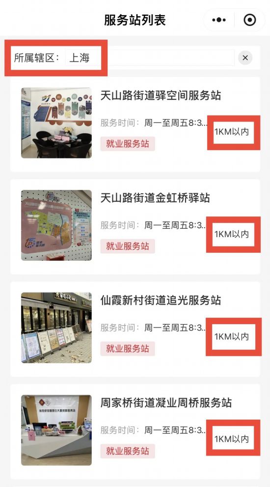 微信搜索“上?;鶎泳蜆I服務平臺”小程序進入查詢頁面,就能輕松查詢到全市所有“15分鐘就業服務圈”社區就業服務站點的詳細地址和服務時間啦!