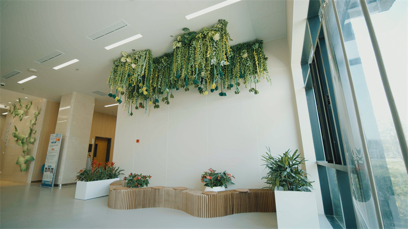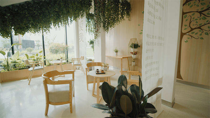 最近,院內打造了“四時心港灣”“788拾光里”“慢寧坊”三處特別心靈療愈空間。記者觀察到,“788拾光里”的每一角落都蘊含著治愈人心的巧思:階梯下的綠植,生機勃勃;垂掛的藤條,雖身處逆境,卻堅韌向上;原木色的桌椅散發著溫暖的氣息,傳遞著積極向上的力量。醫院以“社會共建+人文關懷”為核心,將醫療場景與自然療愈、藝術治愈相融合,面向社會公眾開放,成為人們沉浸式體驗身心療愈的松弛港灣。