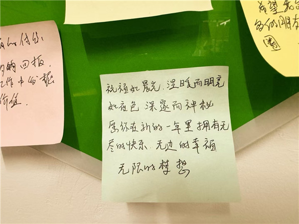 “祝福如晨光,溫暖而明亮;如夜色,深邃而神秘;愿你在新的一年里擁有無盡的快樂、無邊的幸福、無限的夢想?!薄按髮氊愔摇惫婵臻g內,一位外賣小哥在便簽紙上的祝福語,筆觸溫暖,充滿希望。