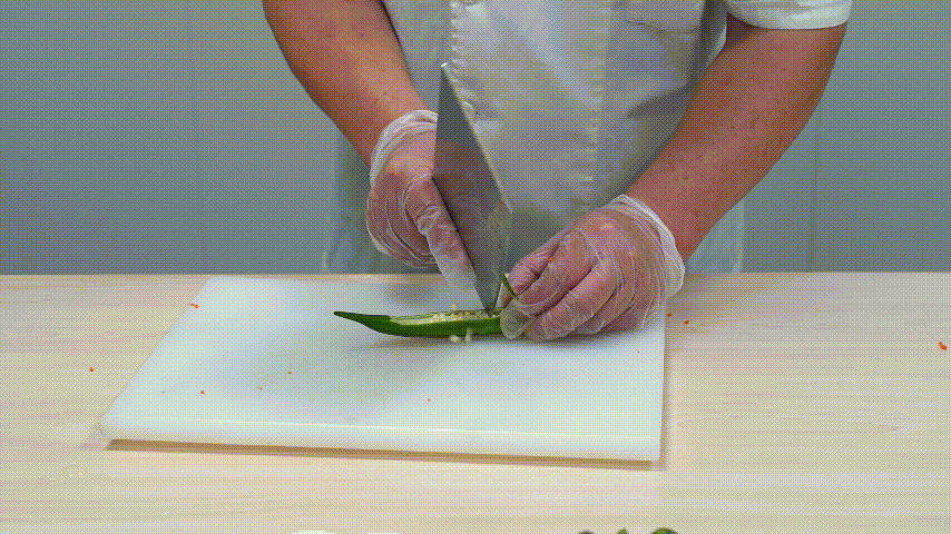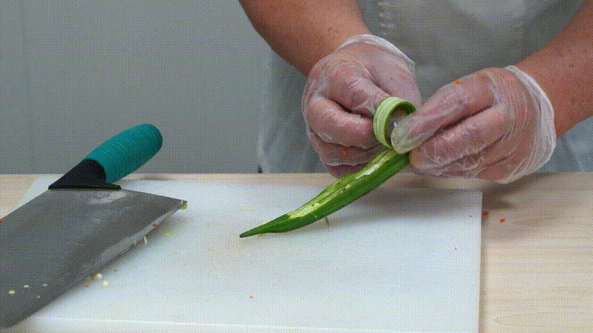 4. 秋葵去梗,片一刀,去除內囊,用牙簽固定。
