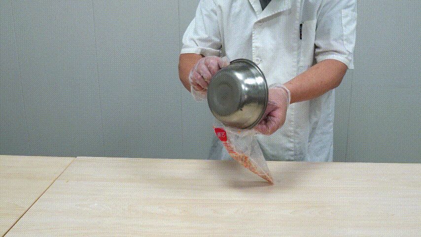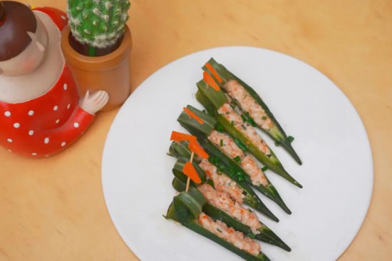 5. 把自制蝦滑裝入裱花袋中,剪開一個小口均勻的擠在秋葵內部。