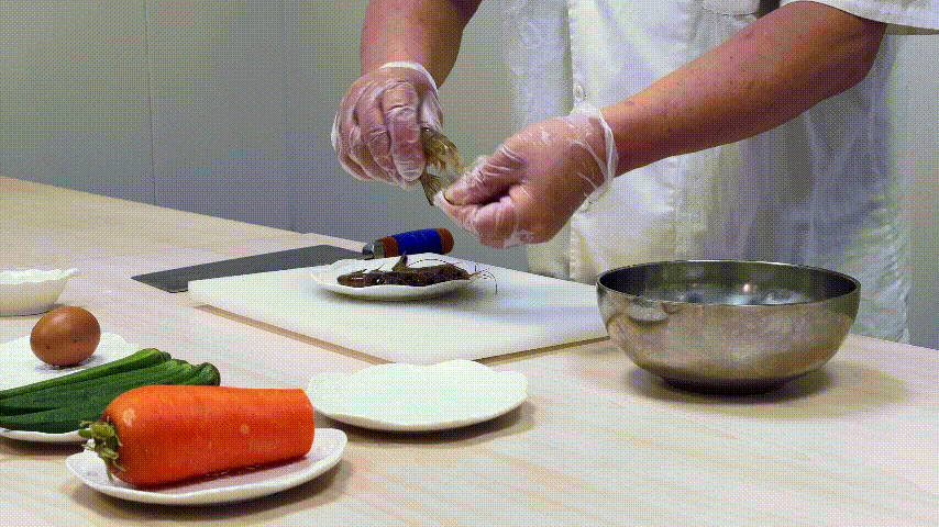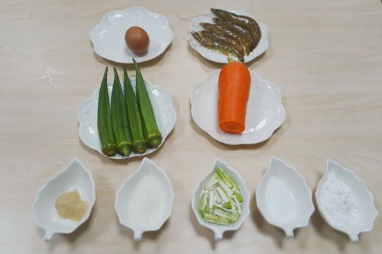 秋葵、基圍蝦、胡蘿卜、雞蛋、鹽、玉米淀粉、白胡椒粉、蔥姜水適量、蔥花、食用油