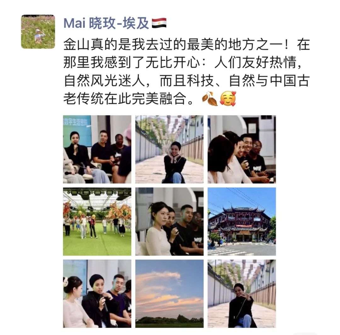 “金山真的是我去過的最美的地方之一!在那里我感到無比開心:人們友好熱情,自然風光迷人,而且科技、自然與中國古老傳統在此完美融合?!薄澳钅畈煌?!超級美麗的金山?!眮碜园<暗纳贤庋幸涣魧W生MAI(曉玫)連續發了兩條九宮格圖文朋友圈,感嘆此次金山行。