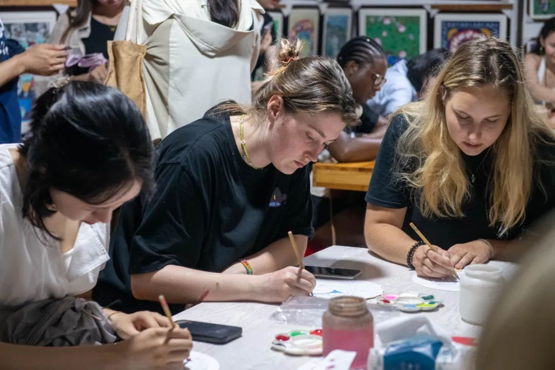 在楓涇古鎮,中外學子沿著蜿蜒的青石板路穿行,一棟棟老宅、老建筑在保持古色古香的原始肌理的同時,內里正不斷蛻變煥新,變成網紅打卡地,為千年古鎮注入煙火新活力。來到丁聰美術館,中外學子通過百余件展品感悟了藝術大師“以筆為劍”的創作人生,其作品中蘊含的樂觀精神與人文關懷引發青年共鳴。