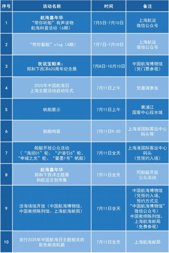 上海市交通委介紹,“中國航海日”(7月11日)是由政府主導、全民參與的全國性法定活動日。2025年是中國航海日設立20周年,也是鄭和下西洋620周年,上海將舉行相關主題活動以及船艇開放、帆船展示、航海嘉年華、涉海文化場館免費開放等豐富多彩的公眾活動,弘揚航海精神、傳承航海文化,加快建設上海國際航運中心,服務交通強國、海洋強國戰略實施。詳見↓
