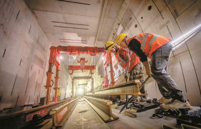 昨天,上海市軌道交通22號線(原崇明線)工程施工現場一派火熱建設景象,在越江大盾構浦東轉換井附近的隧道內,中鐵一局工作人員使用“輪軌式”低噪聲新能源設備鋪設軌道。軌道交通22號線是上海首條穿越長江的軌道交通線路,該線路鋪軌工程已于近日啟動。 (來源:解放日報 記者 孟雨涵)