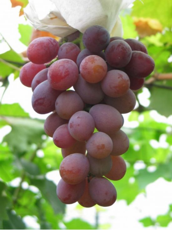 果粒極大,俗稱“乒乓球葡萄”,果皮紅紫至紫黑色,果肉肥厚,肉質較軟,味酸甜,有淡淡的草莓香味,上海地區促成栽培7月下旬成熟。