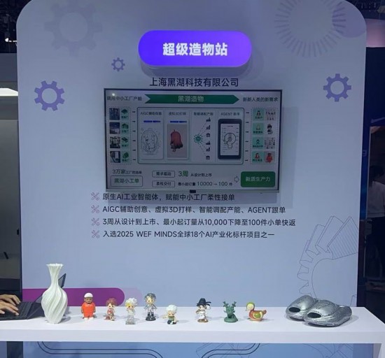 上海企業黑湖科技帶來的“超級造物站”中,擺滿了各種風格獨特的手辦、潮玩。這些產品能與觀眾見面,得益于工業AI Agent。