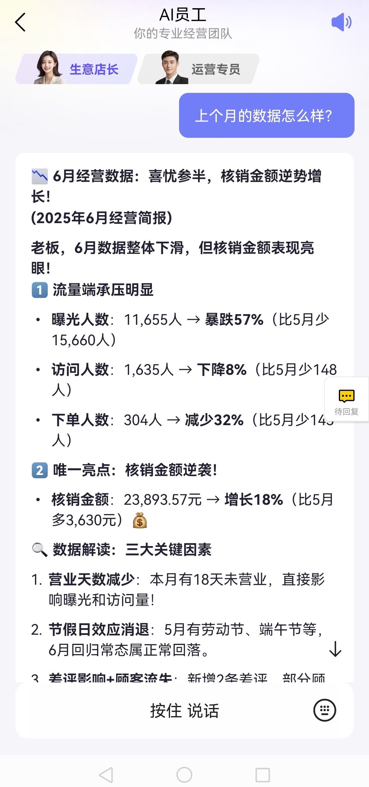 對于視障群體而言,使用智能手機管理生意,尤其是查看圖表形式的經營數據,傳統的“屏幕閱讀器”常常力不從心。美團的AI數字員工正是解決了這個痛點?!吧獾觊L”能將復雜的圖表“翻譯”成商家易懂的分析報告,并通過語音直接朗讀出來,極大方便了視障用戶的日常經營。